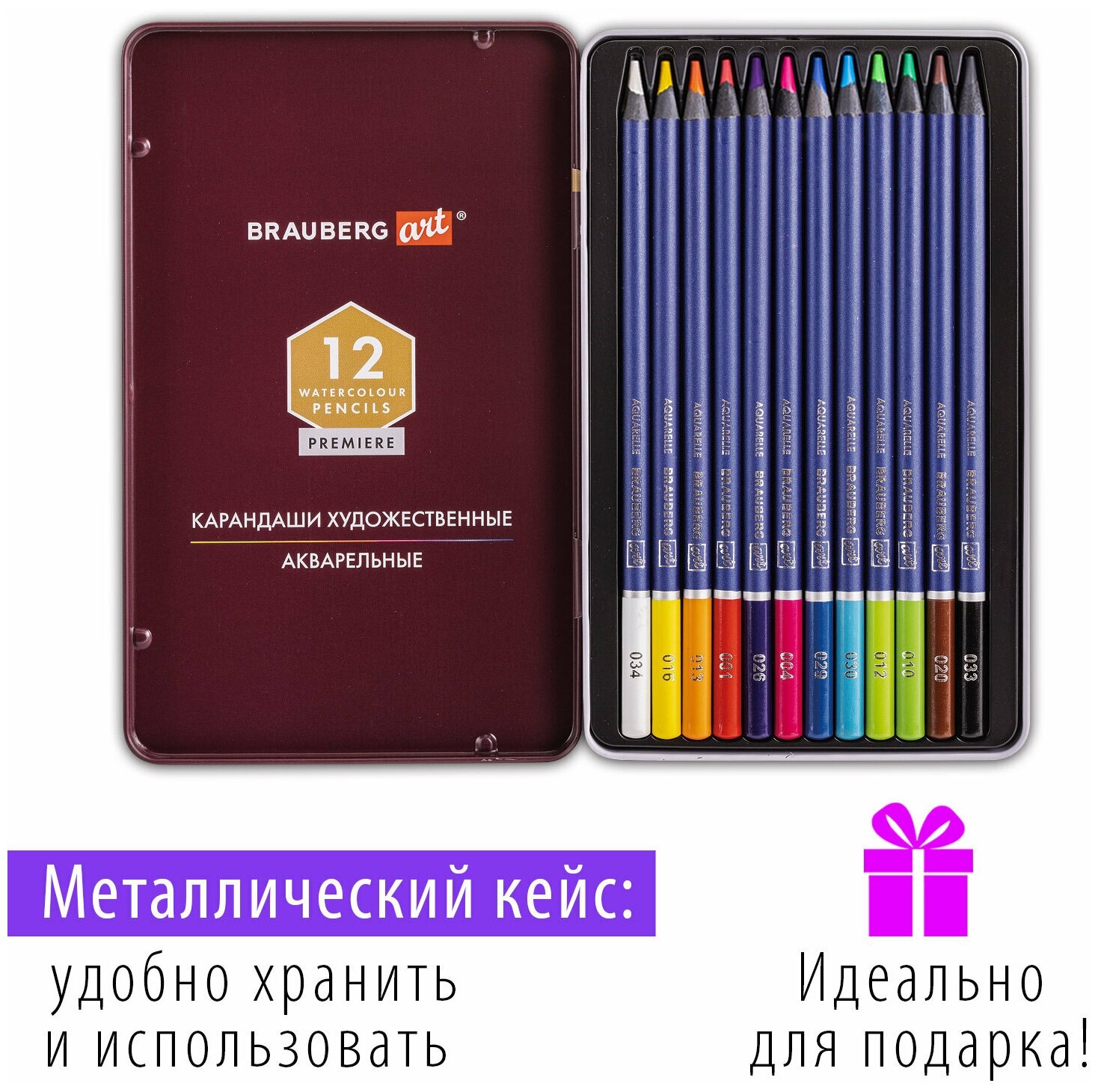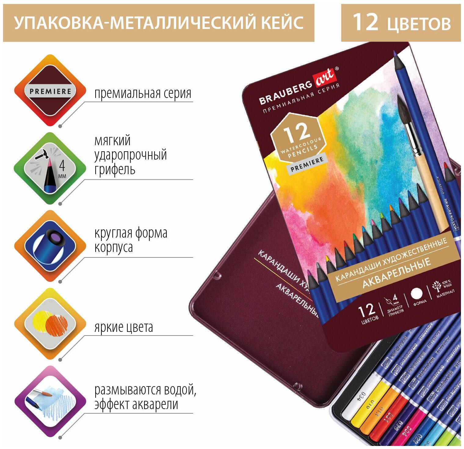 Карандаши цветные акварельные Brauberg Art Premiere, 12 цветов, грифель 4 мм, металл интересное: