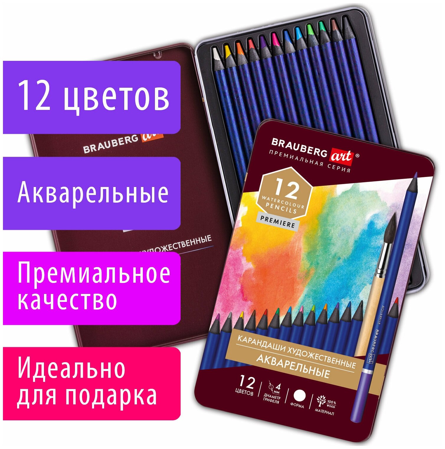 Купить Карандаши цветные акварельные Brauberg Art Premiere, 12 цветов, грифель 4 мм, металл