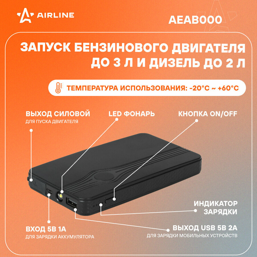 Аккумулятор Внешний "Airline" 2a Booster (Универ., 2xusb, 5v, Фонарь, Пуск Двс, 8000 Мач) AIRLINE арт. AEAB000