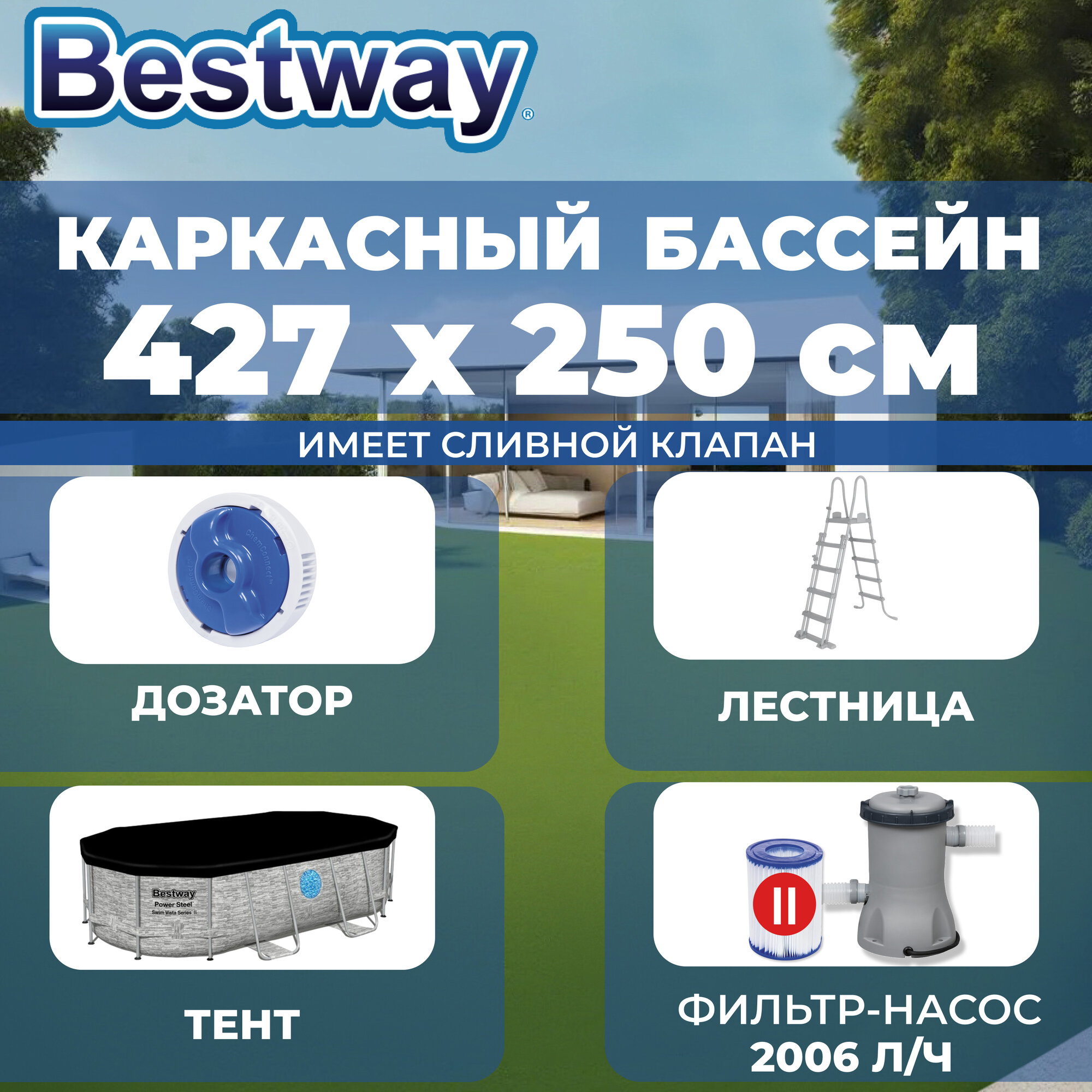Каркасный овальный бассейн Power Steel 427x250x100 см (+ 3 аксессуара, ротанг, окошко!), Bestway