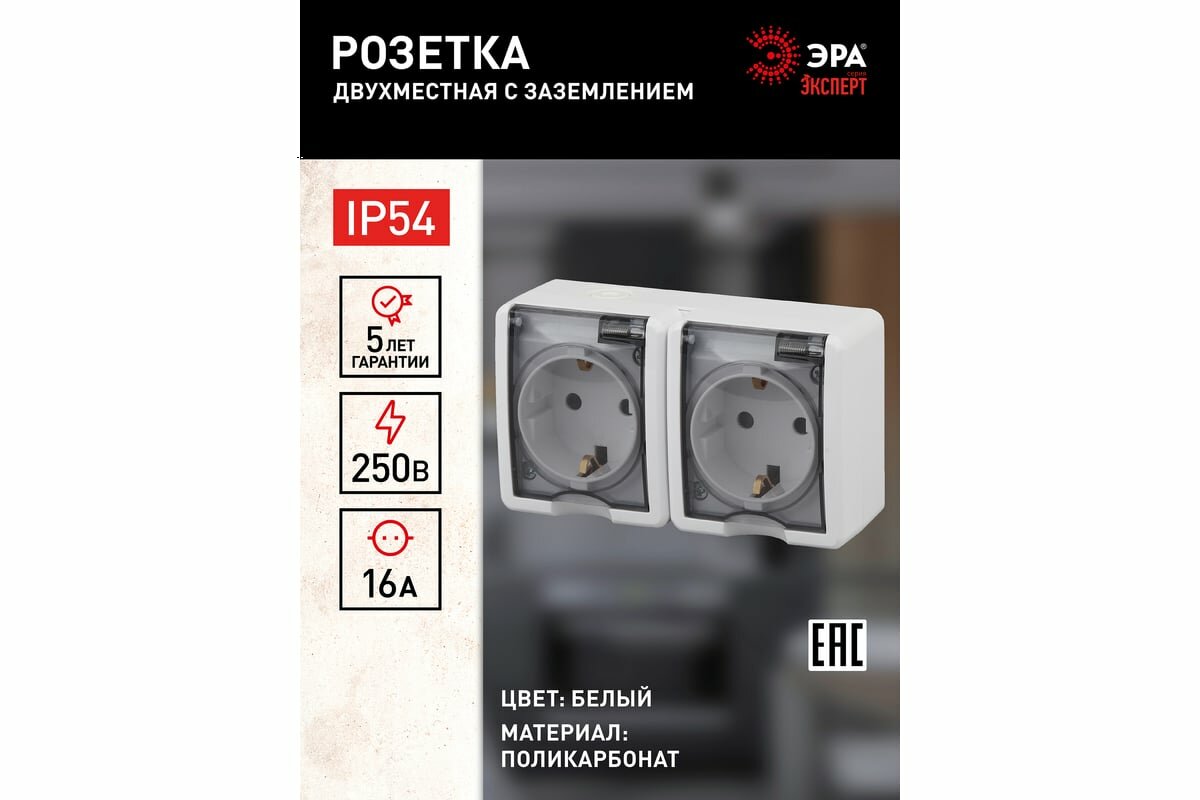 Розетка 2х2P+E IP54, 16A-250В, ОУ, ЭРА Эксперт, белый, 11-2403-01