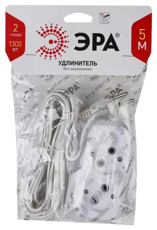 Купить Удлинитель сетевой электрический без заземления ЭРА UX-2-1,5m 2 розетки, 1,5м, 6А