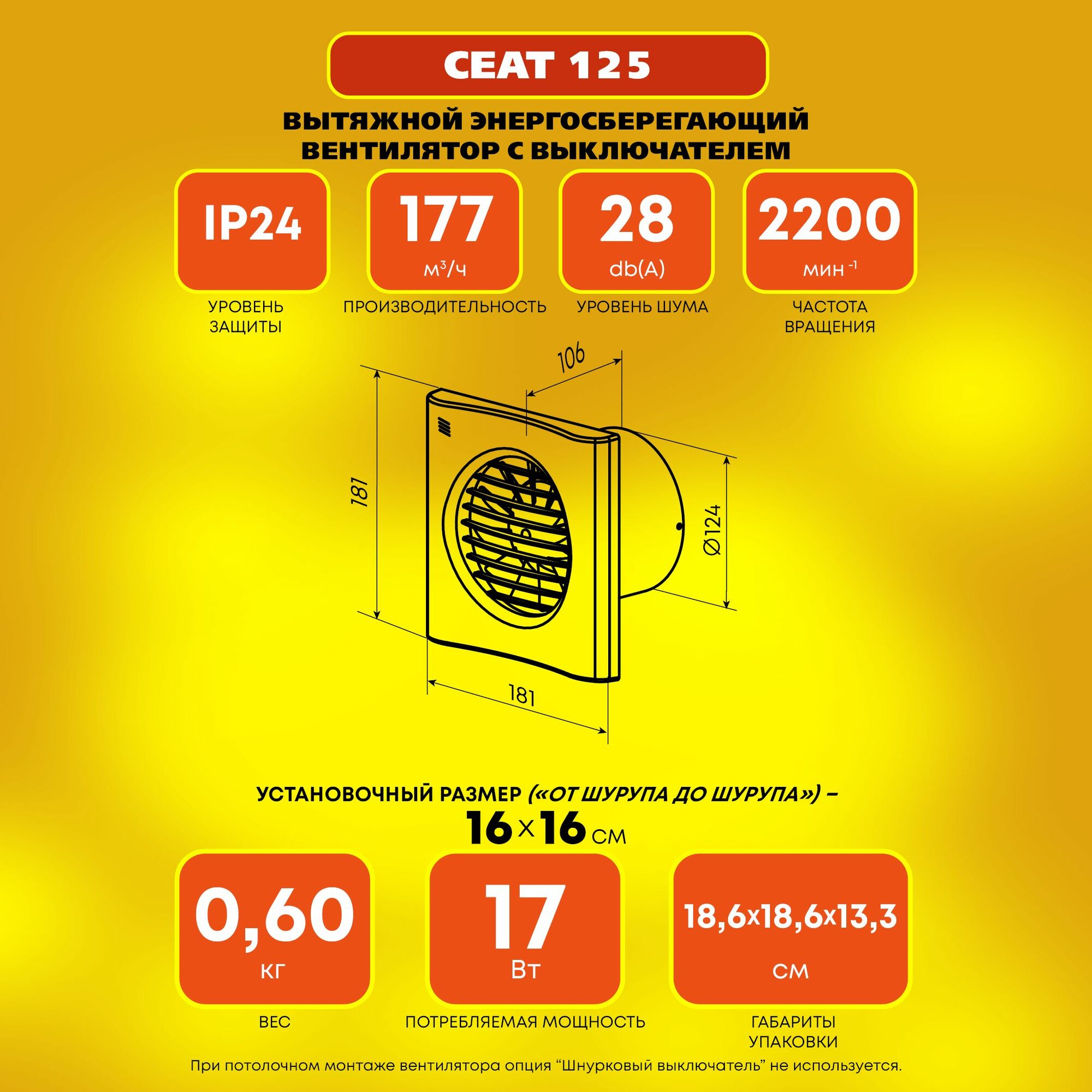 Вентилятор вытяжной тихий Сеат 125, 17 Вт, 28 дБ, 177 м3/ч