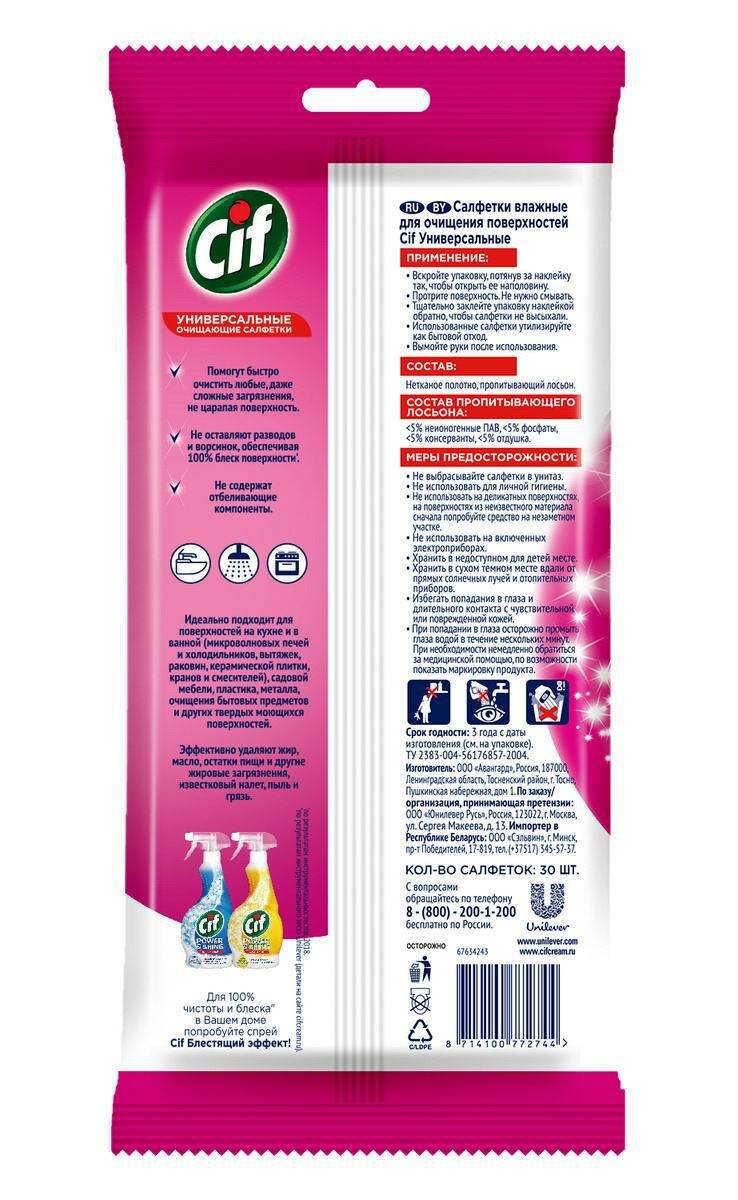 Cif Очищающие влажные салфетки Универсальные, без разводов, 30 шт