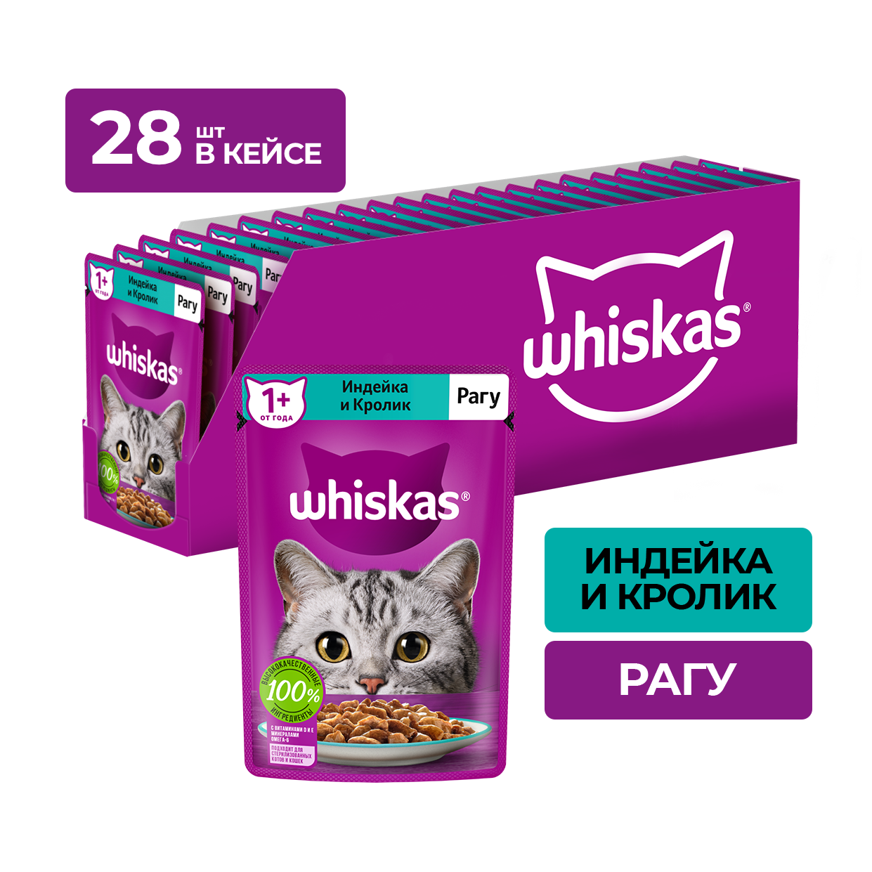 Влажный корм WHISKAS® для кошек, рагу с индейкой и кроликом, 75г*28шт