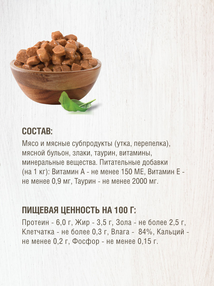 | Состав | мясо и мясные субпродукты (ягненок не менее 4%), мясной бульон, злаки, таурин, витамины, минеральные вещества. |