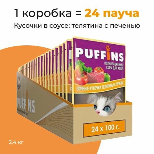 Купить Упаковка 24 пауча для кошек PUFFINS Телятина с печенью в соусе