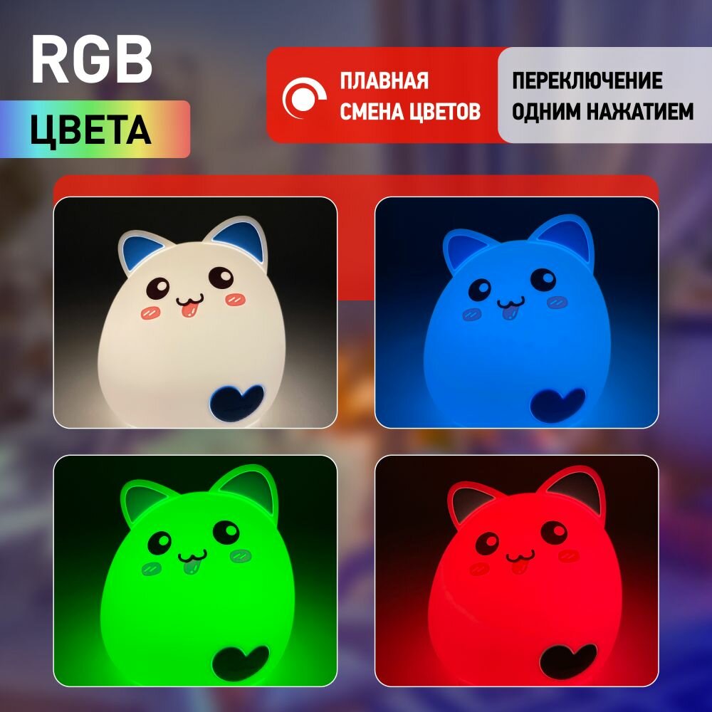 | Дополнительная информация | Светильник-ночник со светодиодами (LED) в качестве источников света. "Мягкий" материал. Работает от встроенного литиевого аккумулятора. Подзарядка от USB. USB кабель в комплекте. Выключатель для отключения/блокировки сенсора. 3 режима (переключение прикосновением): белый свет половина яркости, белый свет максимальная яркость, RGB c переходами цветов. Дизайн в виде зайца. |