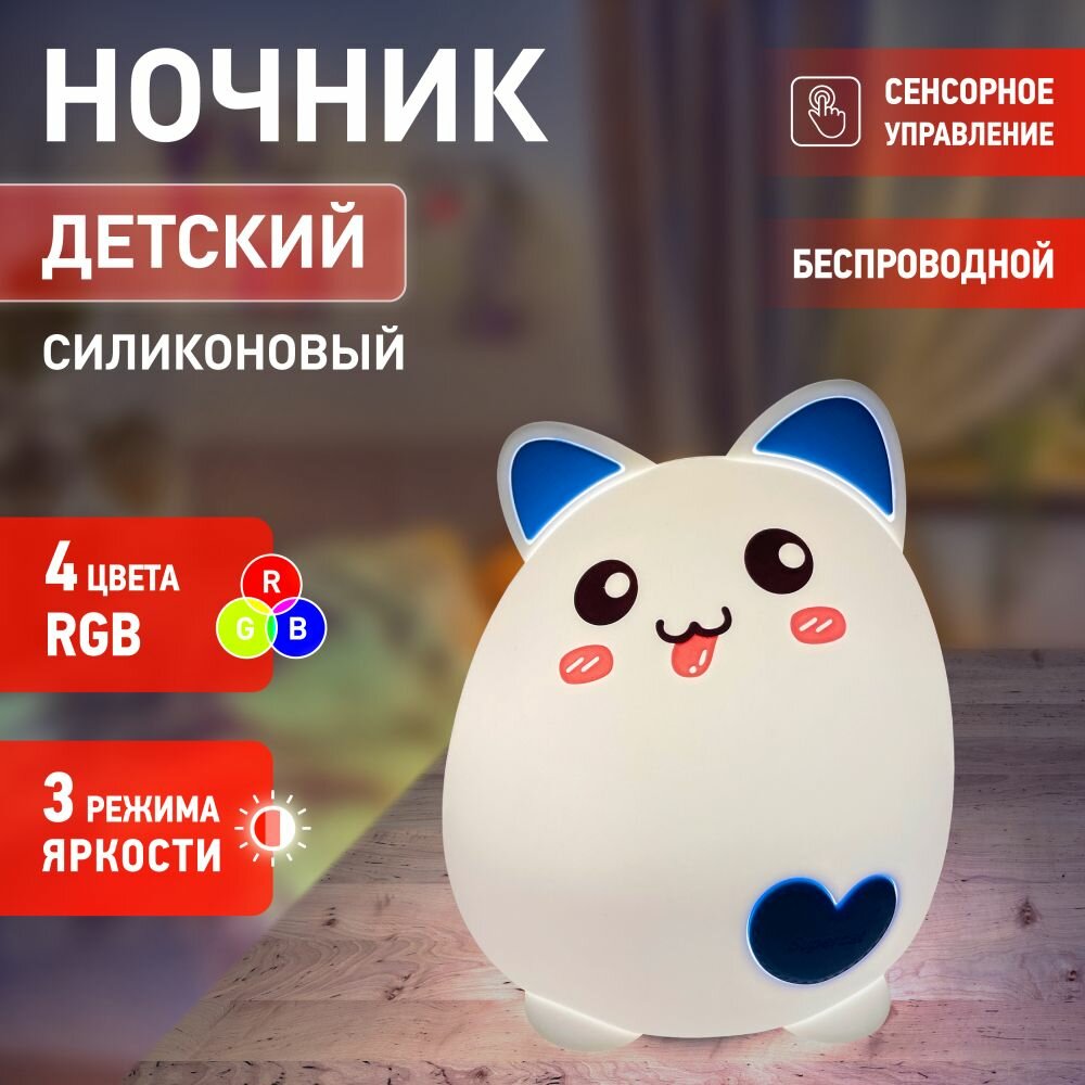 Ночник детский антистресс ЭРА NLED-414-2W-BU Кот светодиодный USB, диммер, сенсор, настольный