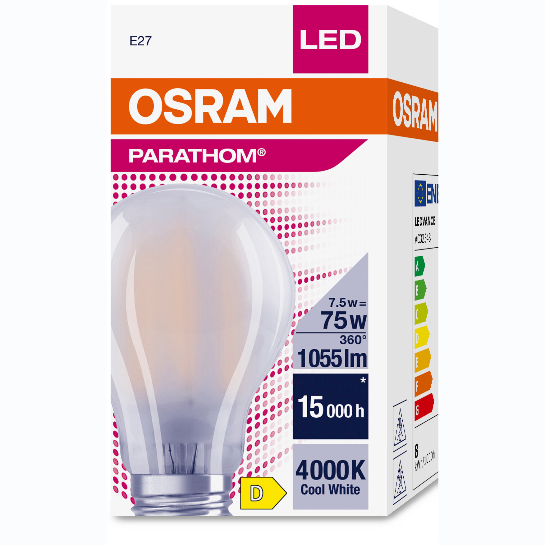 10 шт/уп. Лампа LED Груша 7.5W 220-240V E27 1055Лм 4000К Угол 300 град. D-60mm L-105mm Филаментная Стекло Диммируемая Свет Нейтральный белый OSRAM, уп. 10шт