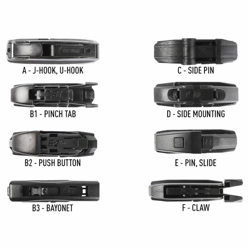 | Тип крепления | боковое крепление (Side Mounting) / боковой зажим (pinch tab) / боковой штырь (side pin) / клешня (claw) / кнопка (push button) / крючок (hook) / штыковой замок (bayonet) |