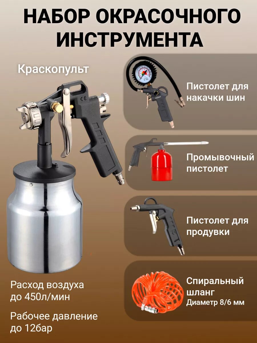 | Комплектация | краскопульт с нижним бачком, продувочный пистолет, пистолет для накачки шин, промывочный пистолет, спиральный шланг 5м. |