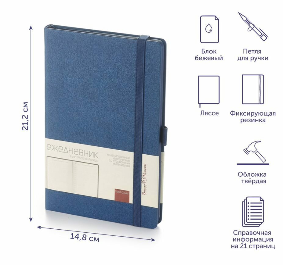Ежедневник недатированный, А5, твердый картон 7Бц, кожзам, 136 листов, цвет синий Monaco BrunoVisconti