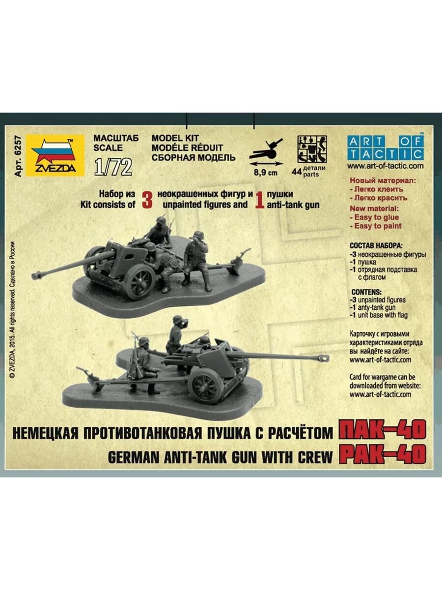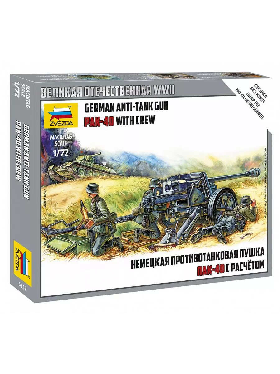 Ниже Вы можете прочитать отзывы на Сборная модель Звезда Немецкая противотанковая пушка ПАК-40, 1/72 6257, ознакомится с подробными характеристиками, посмотреть интересные обзоры и фотографии на Сборная модель Звезда Немецкая противотанковая пушка ПАК-40, 1/72 6257.