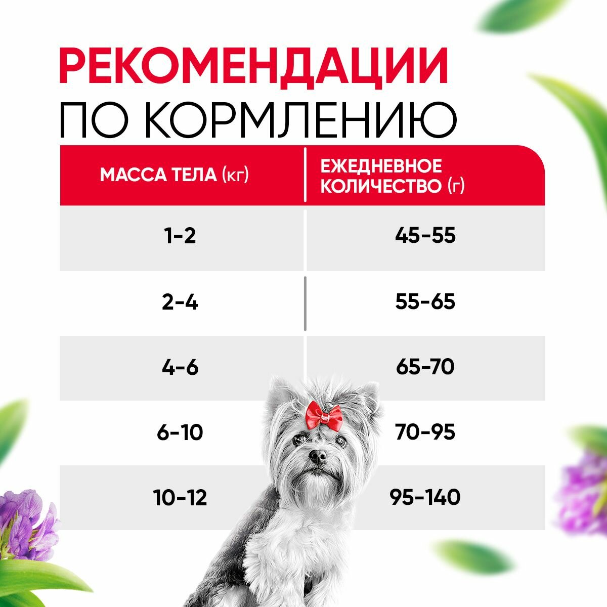 | Дозировка | - вес собаки до 2 кг: 35 г/сут. - вес собаки 2-4 кг: 35-45 г/сут. - вес собаки 4-6 кг: 45-85 г/сут. - вес собаки 6-10 кг: 85-175 г/сут. |
