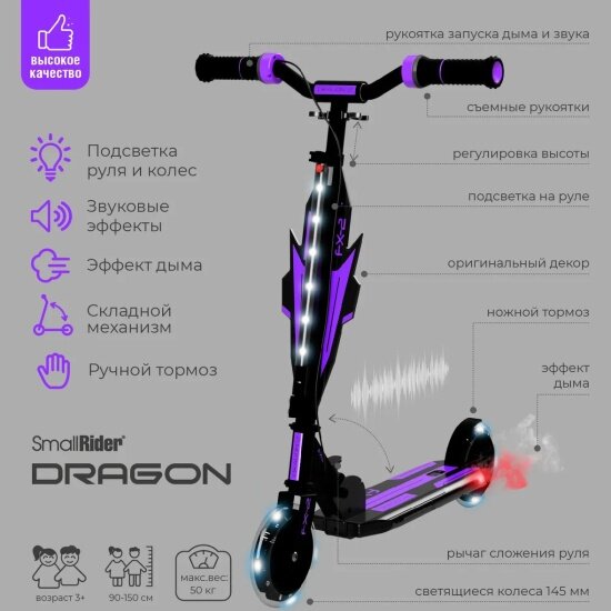 Детский самокат с дымом, ревом мотора и подсветкой Small Rider Dragon 2 (фиолетовый), DRAGON2violet