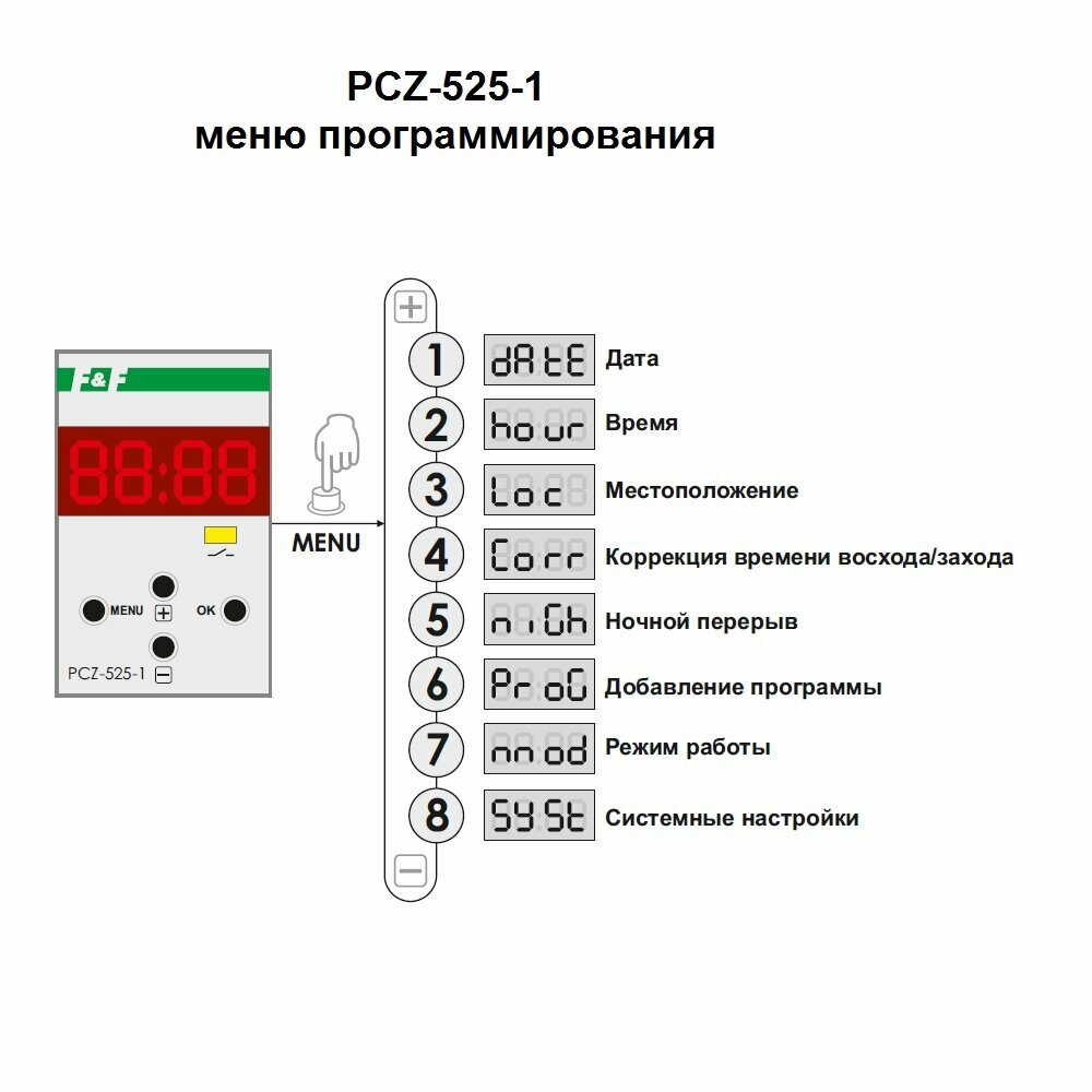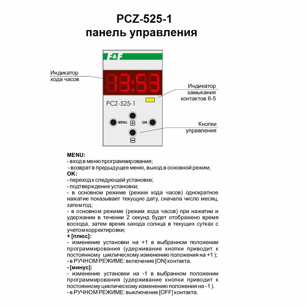 Реле времени PCZ-525-1 (1 канал астрономическое коррекция вр. вкл./выкл. ночной перерыв установка независимых программ работы по дням недели 230В 16А 1P IP20 монтаж на DIN-рейке) F&F EA02.002.011