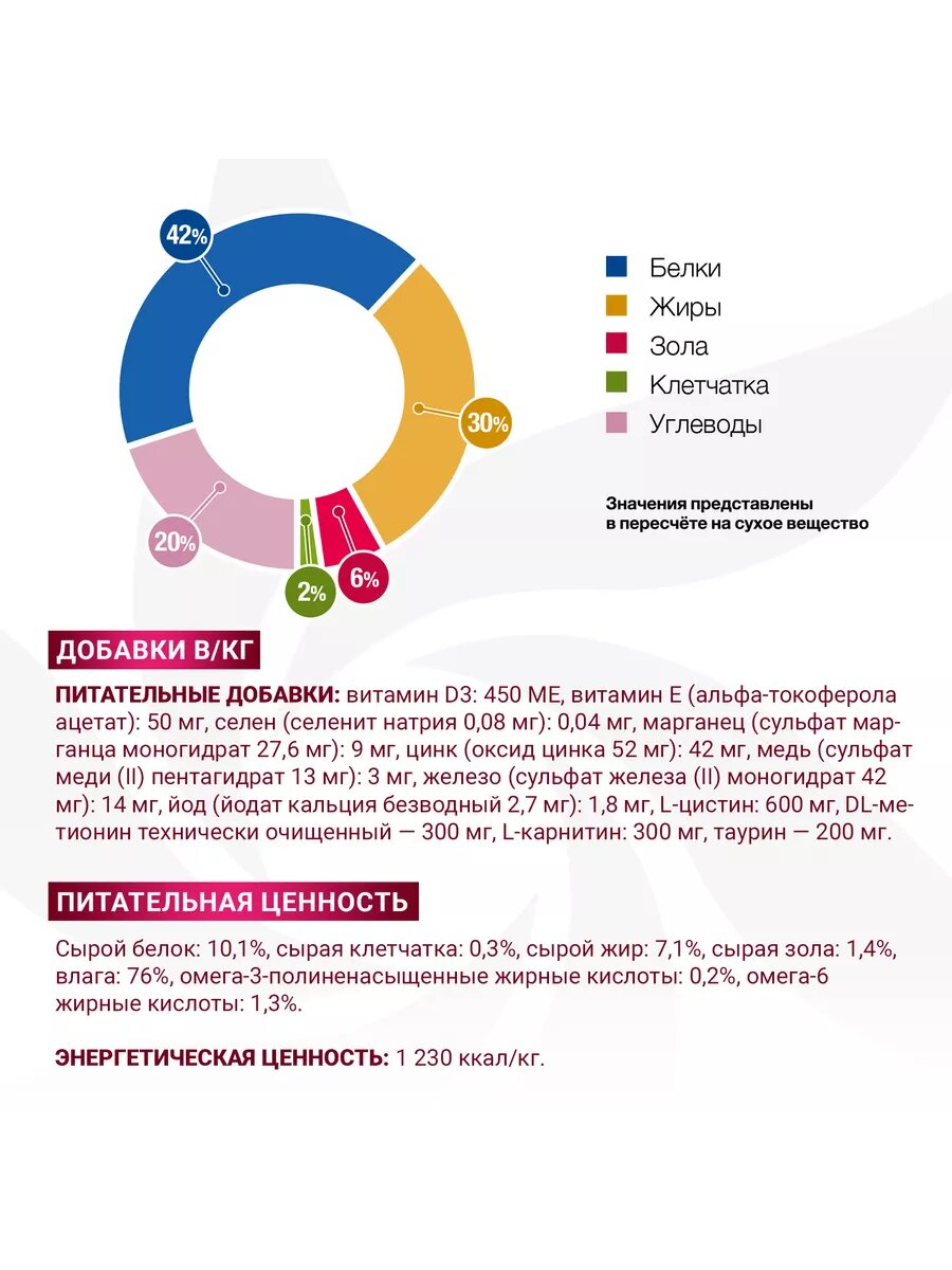 | Состав | яйца, овощи (тапиока и зеленый горошек), свиная печень, масла и жиры (очищенное масло лосося), рыба (лосось), минеральные вещества, производные растительного происхождения, дрожжи (свободные нуклеотиды мин. 44%), экстракт камелии китайской (0,05%) |