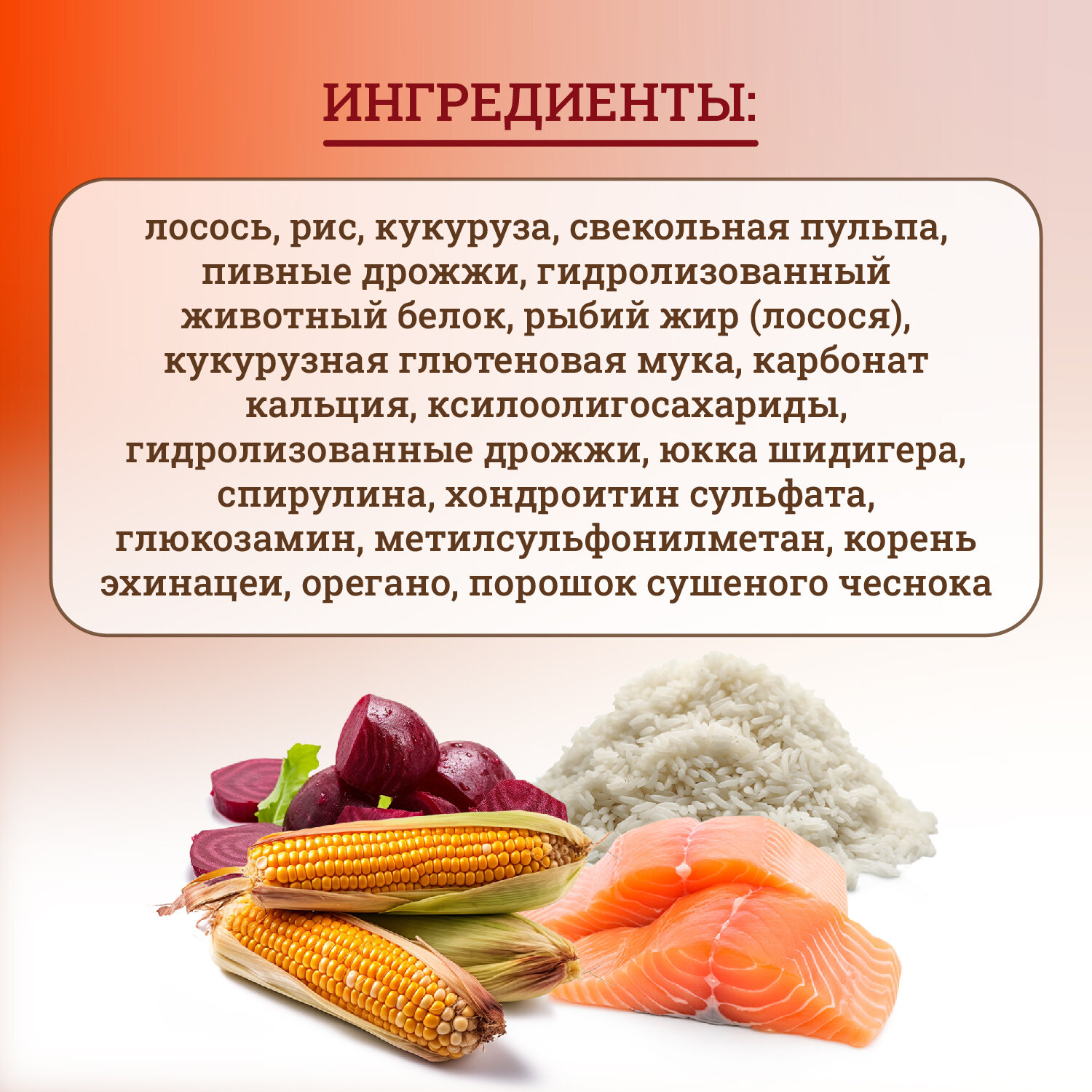 | Состав | рыба (26% дегидрированного и 10% свежего лосося), рис, кукуруза, сухая свекольная пульпа, пивные дрожжи (источник МОС и витамина B12), гидролизованный белок рыбы, рыбий жир (масло лосося, консервированное с помощью натуральных антиоксидантов), кукурузная глютеновая мука, карбонат кальция, КОС (ксилоолигосахариды 3 г/кг), гидролизованные дрожжи (МОС), юкка Шидигера, спирулина, гидролизованные хрящи (источник хондроитина сульфата), гидролизованные ракообразные (источник глюкозамина), метилсульфонилметан, корень эхинацеи, орегано, порошок сушеного чеснока |