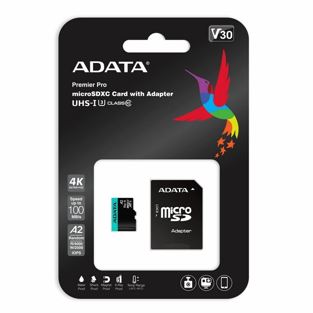 Карта памяти microSDXC UHS-I U3 A-Data Premier Pro 256 ГБ, 100 МБ/с, Class 10, AUSDX256GUI3V30SA2-RA1, 1 шт., переходник SD