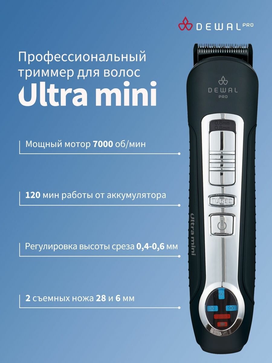 Машинка для стрижки окантовочная DEWAL PRO ULTRA MINI, акк\сет, 7000 об\мин, 2 ножа, 0.4-0.6 мм, 4 насадки, черная 03-012