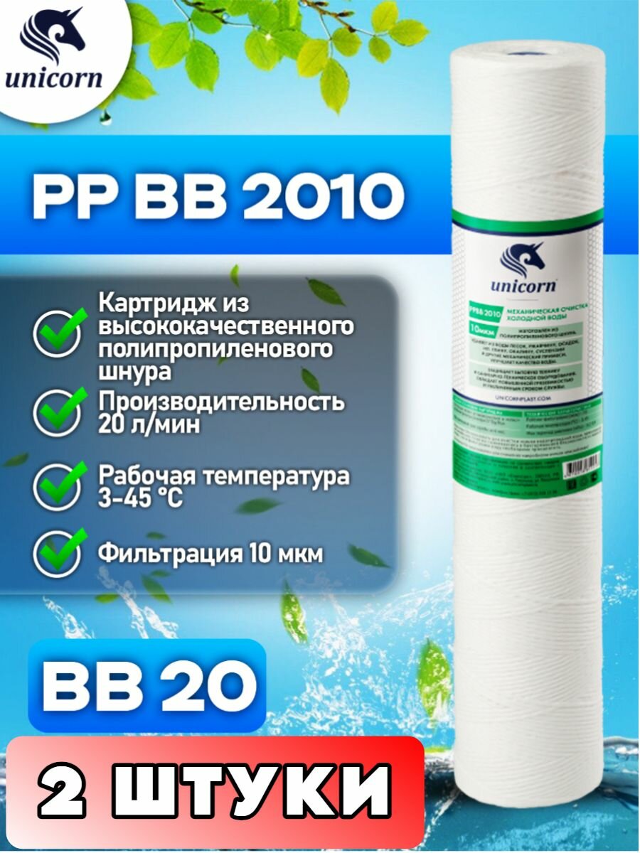 Купить Картридж для фильтра воды механическая очистка из полипропиленового шнура для холодной воды типоразмер 20"ВВ (Big Blue) фильтрация 10 микрон Unicorn PPBB2010 2 штуки