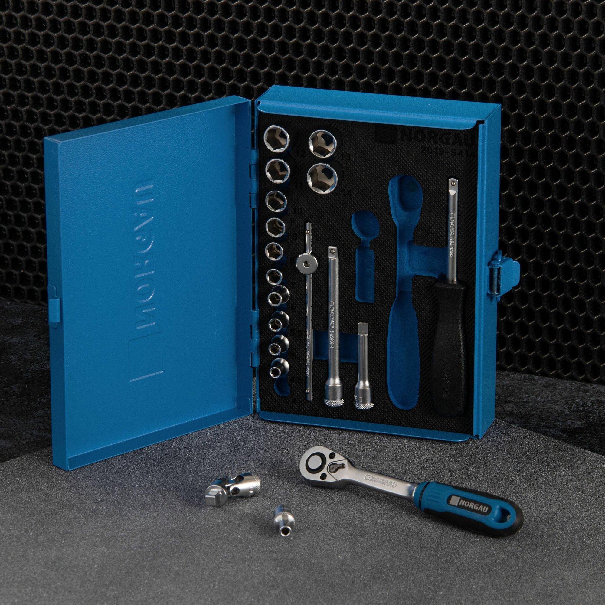 Набор шестигранных торцевых головок NORGAU Industrial (4 - 14 мм) под квадрат 1/4” с трещоткой, 19 предметов в ящике