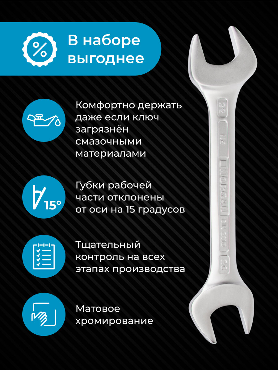 Набор гаечных ключей NORGAU Industrial, двусторонних рожковых, HРM High precision machiningт 6x7-30x32, 10 шт интересное: