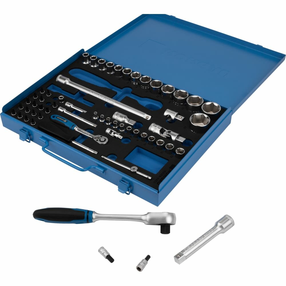 Набор головок торцевых под квадрат 1/2"-1/4" NORGAU Industrial шестигранных с трещоткой и аксессуарами, 58 предметов