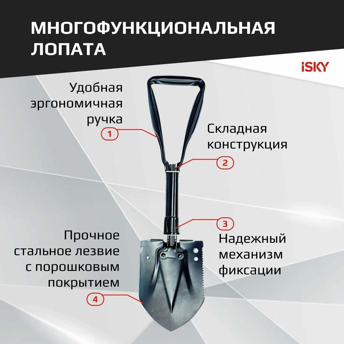 iSky Лопата саперная iSky (24-58 см), металлическая, складная, черная, в чехле