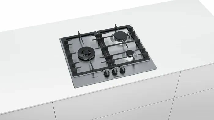 Встраиваемая варочная панель Bosch Газ, 60 см, 3 конфорки, горелка с двойным пламенем, тип - нержавеющая сталь, независимая, серебристый цвет