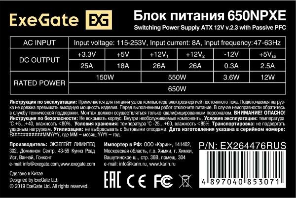 Блок питания 650W ExeGate 650NPXE (ATX, PPFC, 12cm fan, 24pin, 2x(4+4)pin, 2xPCI-E, 5xSATA, 3xIDE, black) EX264476RUS