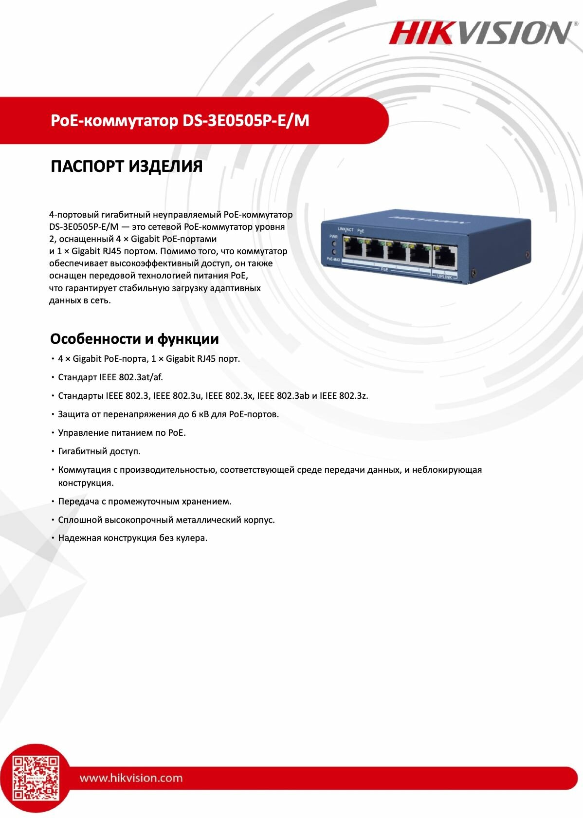 Коммутатор неуправляемый Hikvision DS-3E0505P-E/M интересное: