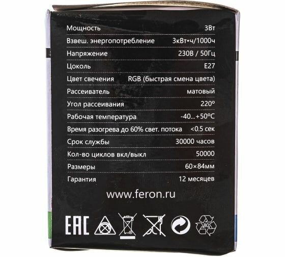 Купить Светодиодная лампа Feron LB-371 "Шар RGB" 3Вт Е27, быстрая смена цвета
