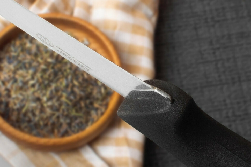 | Плюсы: | Тонкое лезвие, удобная ручка, с завода остро заточено, в комплекте есть точилка для домохозяек. |
