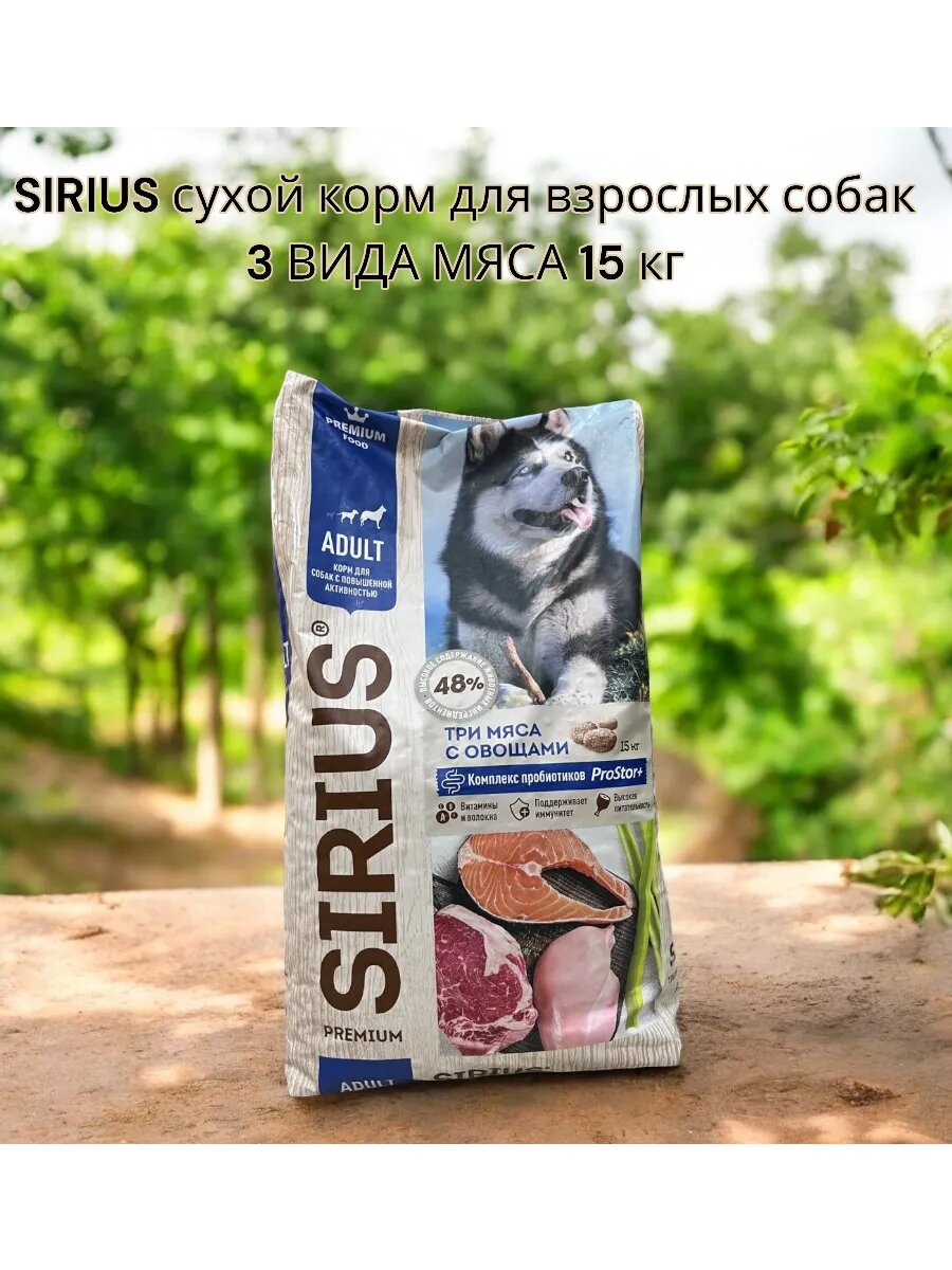 SIRIUS Сухой полнорационный корм для собак с повышенной активностью, 3 мяса с овощами 15кг