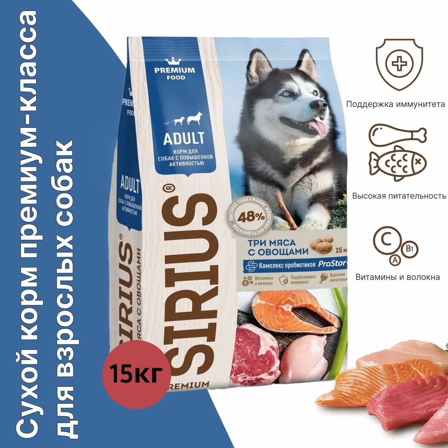 Sirius Сухой корм для собак с повышенной активностью, три мяса с овощами , 15 кг