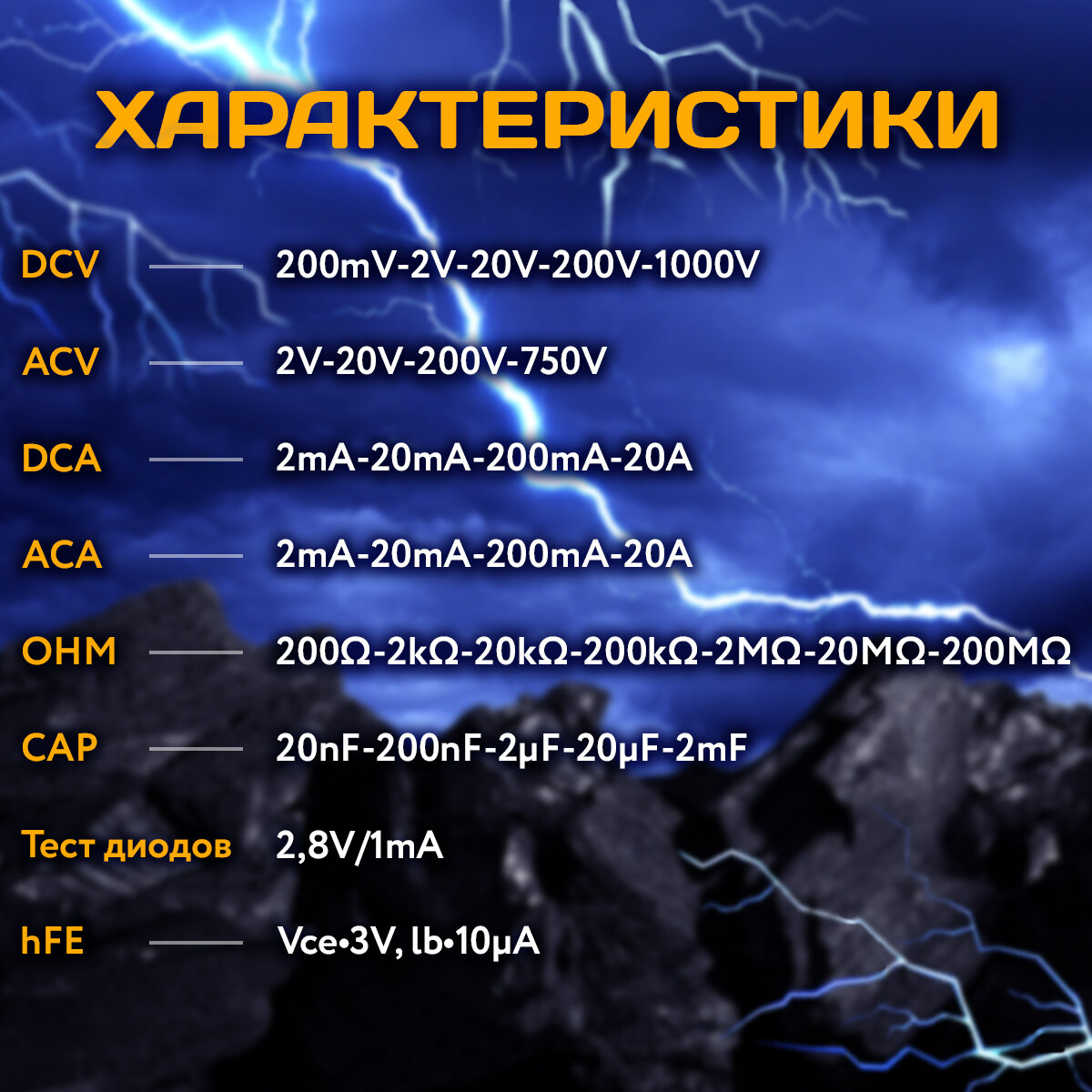 | Функции | выявление повреждения проводки и соединения, измерение емкости конденсаторов, измерение переменного напряжения, измерение постоянного напряжения, измерение работоспособности диодов и транзисторов, измерение силы переменного тока, измерение силы постоянного тока, измерение сопротивления |