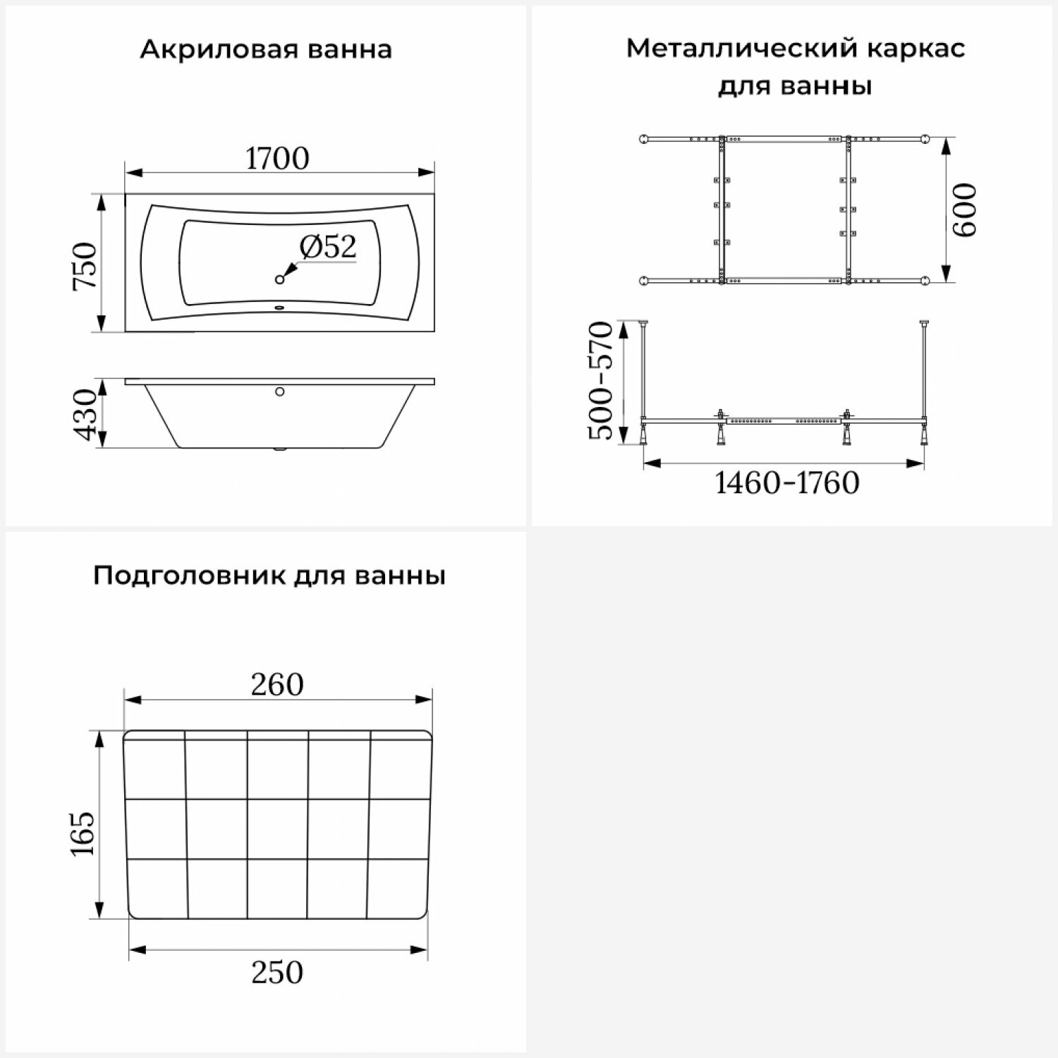 Акриловая ванна 170х75 см Lavinia Boho Evan набор 3 в 1 S1-3711017P: прямоугольная ванна, металлический каркас, подголовник