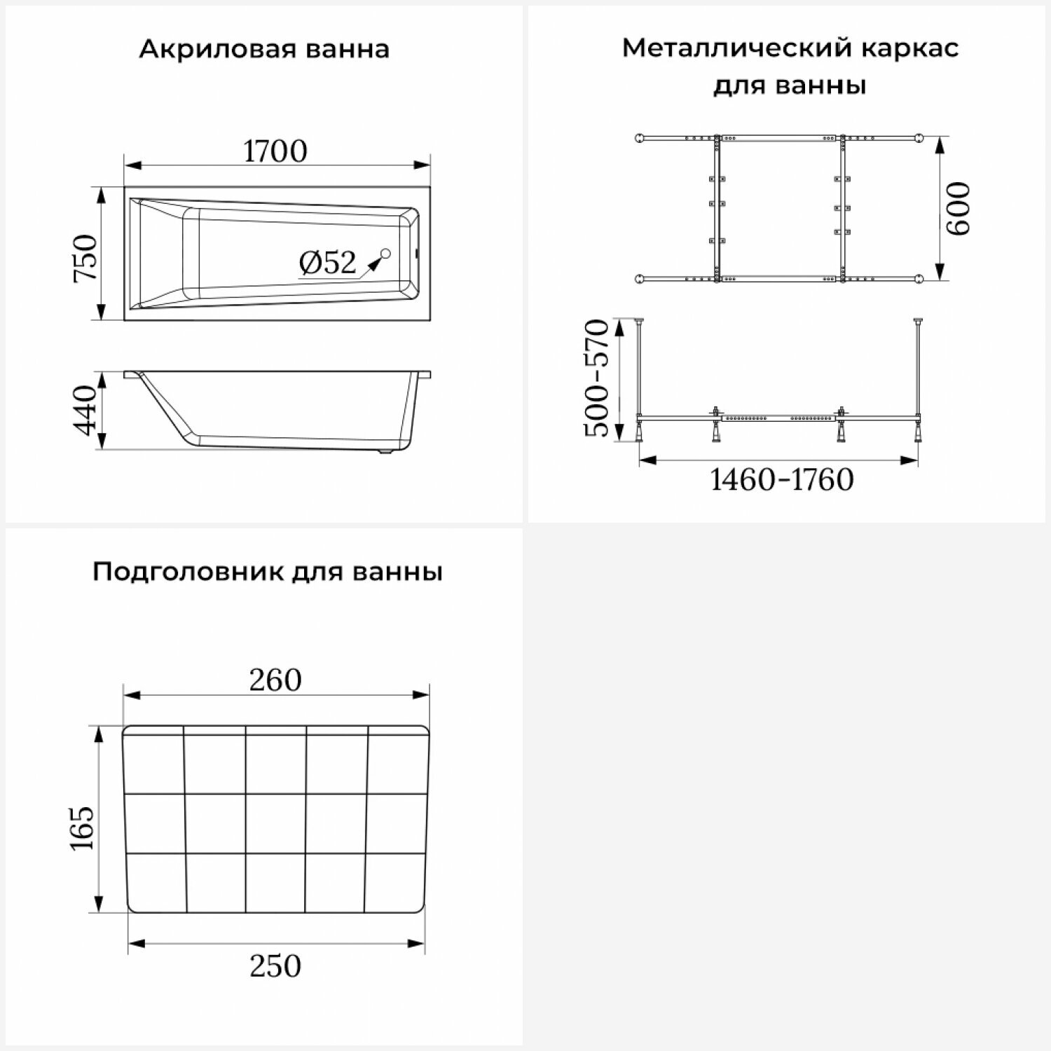 Акриловая ванна 170х75 см Lavinia Boho Rock набор 3 в 1 S1-3707075P: прямоугольная ванна, металлический каркас, подголовник