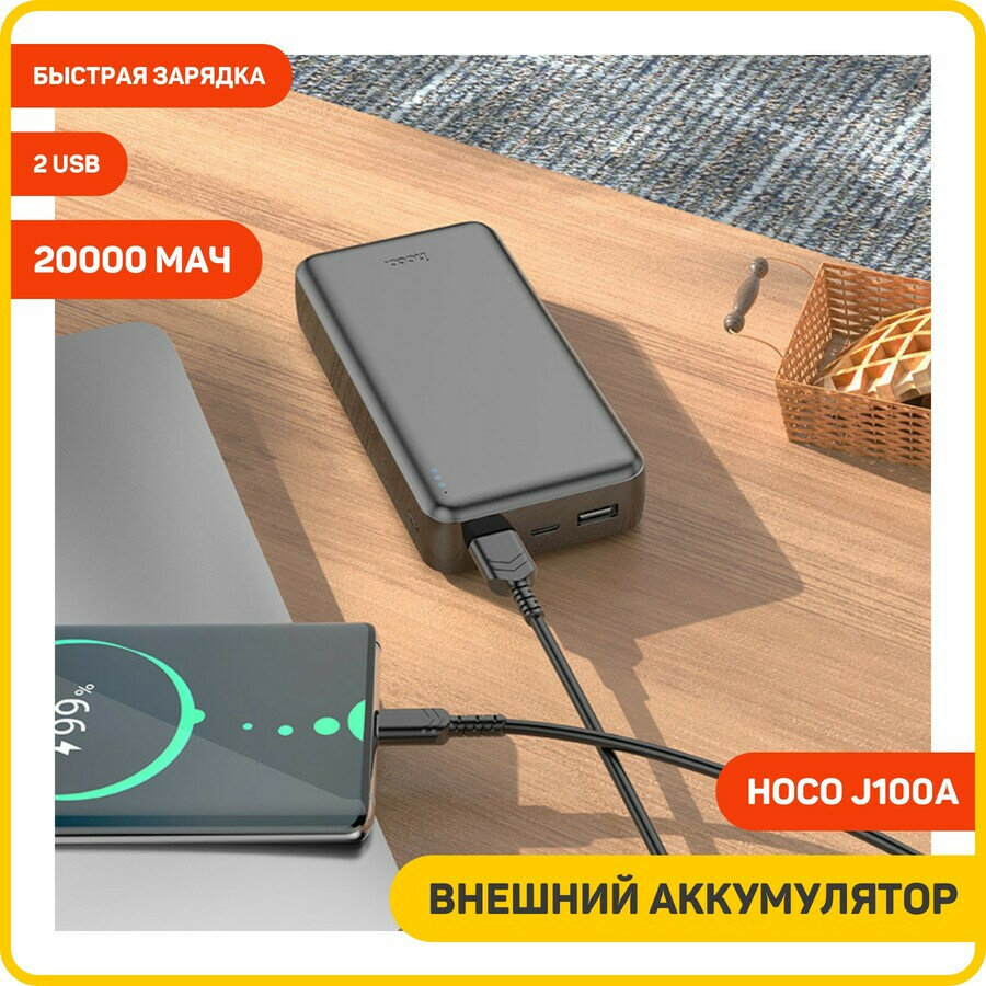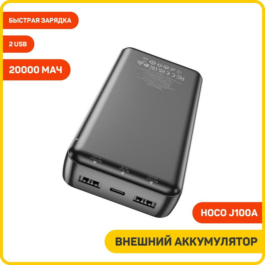 Универсальный Доп. Аккумулятор 20000mAh, J100A, HOCO, выход: 2 USB (5V/2A), черный