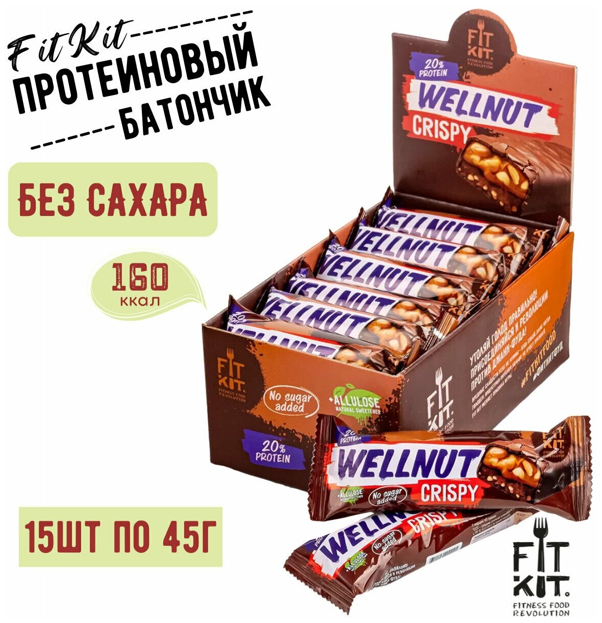 Протеиновый батончик FIT KIT Wellnut Crispy Protein BAR без сахара, 15штХ45г