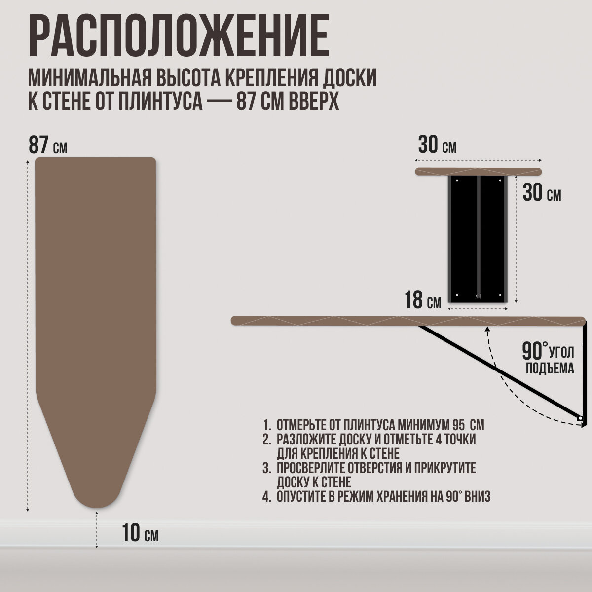 | Дополнительная информация | складная; имеется усиленное металлическое крепление к стене; можно установить на необходимой высоте, удобной для глажки с учетом роста |