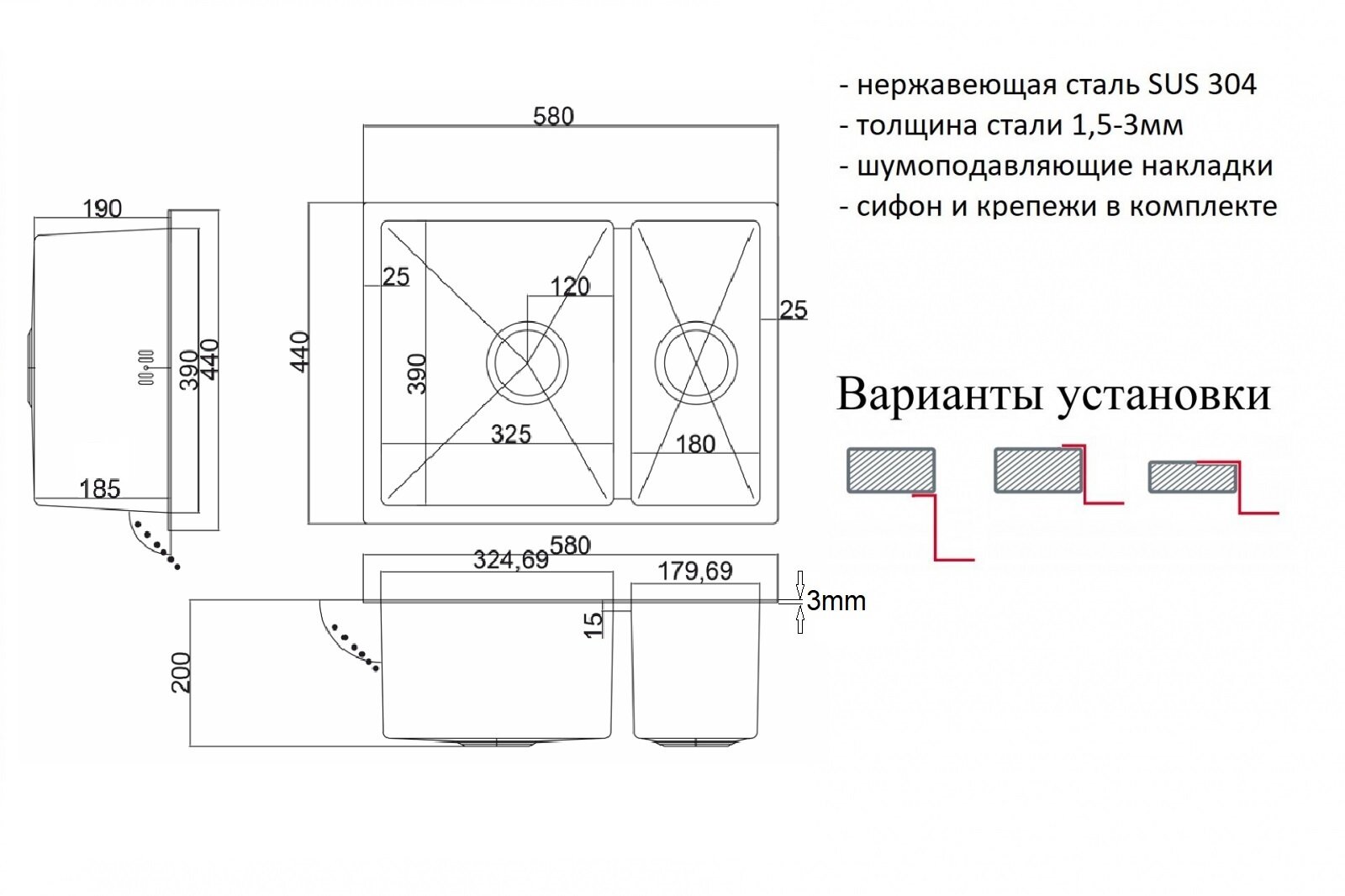 | Особенности | дополнительная чаша / корзинчатый вентиль / отверстие под смеситель / сливная арматура |