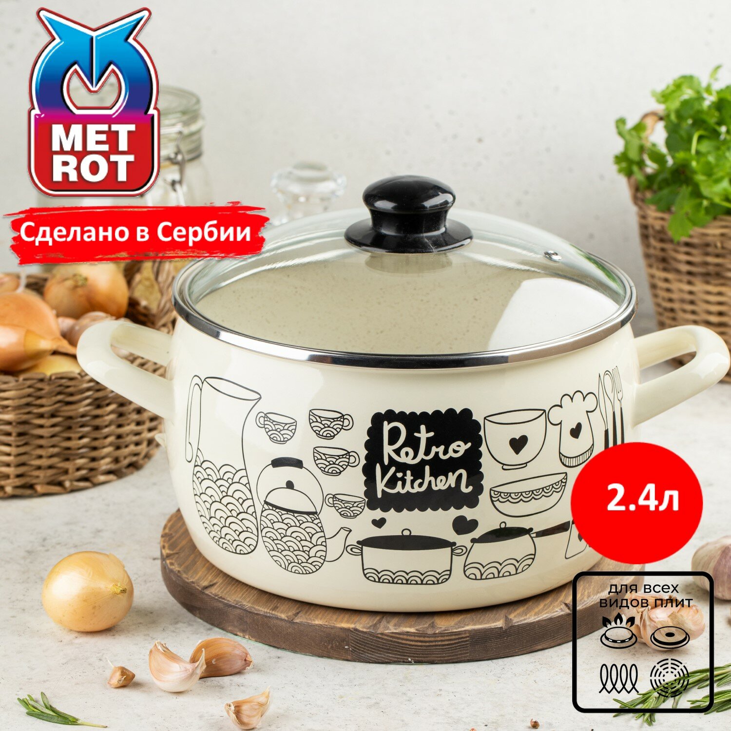 Кастрюля эмалированная из стали Metrot / Метрот Ретро, объемом 3.3л со стеклянной крышкой, для всех видов плит / посуда для кухни