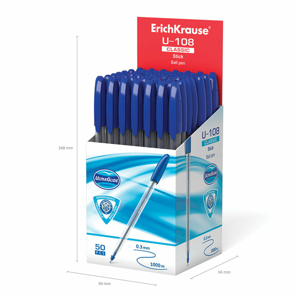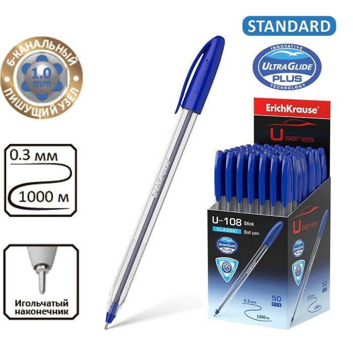 Ручка шариковая ErichKrause U-108 Classic Stick, игольчатый узел 1,0 мм, чернила синие, ультра-мягкое письмо, 50 штук