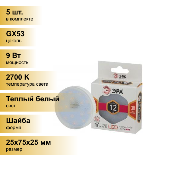 Купить (5 шт.) Светодиодная лампочка ЭРА стандарт GX53 9W(720lm) 2700K 2K 25x75 6834 Теплый белый. Цоколь GX53