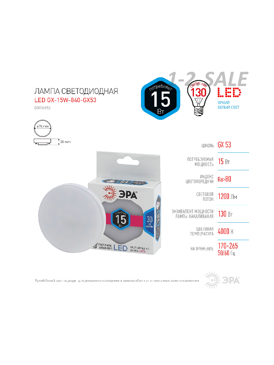 Купить (5 шт.) Светодиодная лампочка ЭРА стандарт GX53 15W(1200lm) 4000K 4K LED-GX-15W-840-GX53 3990 Нейтральный белый. Цоколь GX53