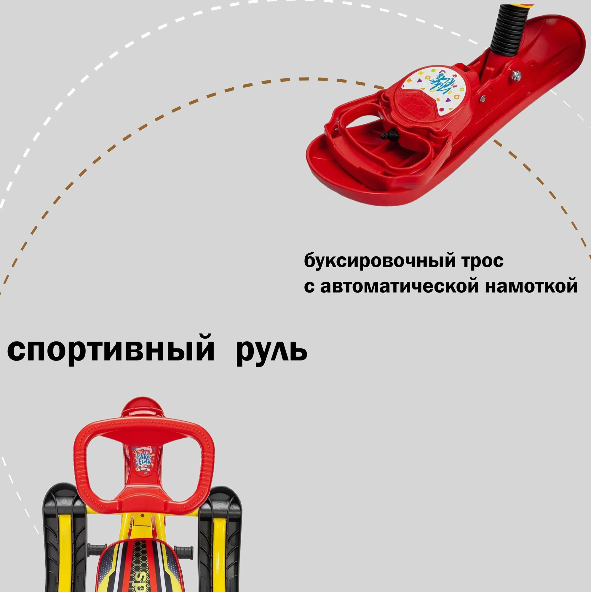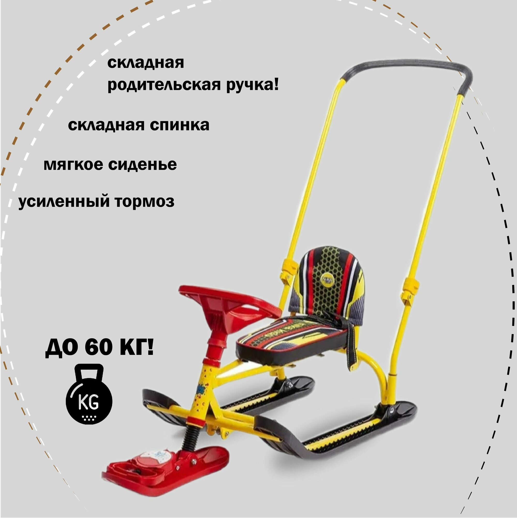 | Комплектация | металлический каркас, лыжи, сиденье со спинкой, руль, родительская ручка, трос |