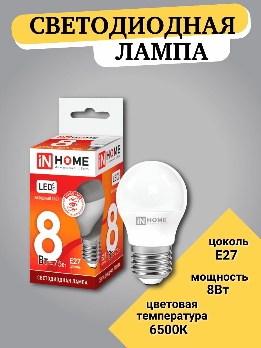 IN HOME Лампа светодиодная LED-ШАР-VC 8Вт шар 6500К холод. бел. E27 760лм 230В 4690612024905